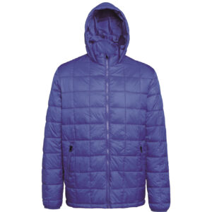 Hooded lightweight jacket. All over box quilting. Two external side pockets and a internal covered zip pocket. Headphone loop. Elasticated cuffs. High neck collar stand with attached hood. Access point on reverse underside to for easy embellishment on the back of the jacket.